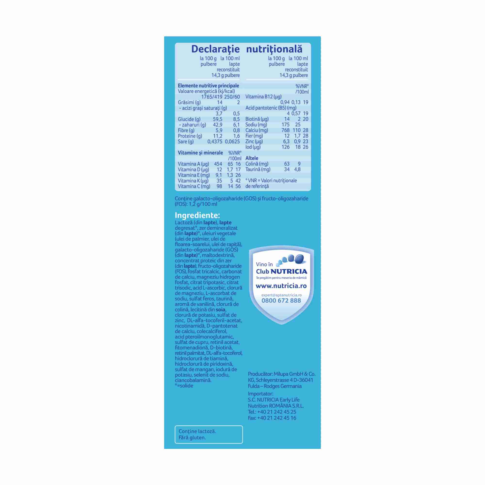 • Nutri-Fibre – Mixul nostru unic de fibre GOS/FOS si 3′-GL**: GOS/FOS imita structura oligozaharidelor prezente in laptele matern. **3′-GL este o oligozaharida cu structura identica celei regasite in laptele matern. 3′-GL provine din procesul nostru unic Lactofidus.