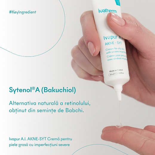 – Sytenol A este un ingredient inovator ce reduce secreţia de sebum, are efect calmant şi frânează proliferarea microorganismelor responsabile de imperfecţiuni;