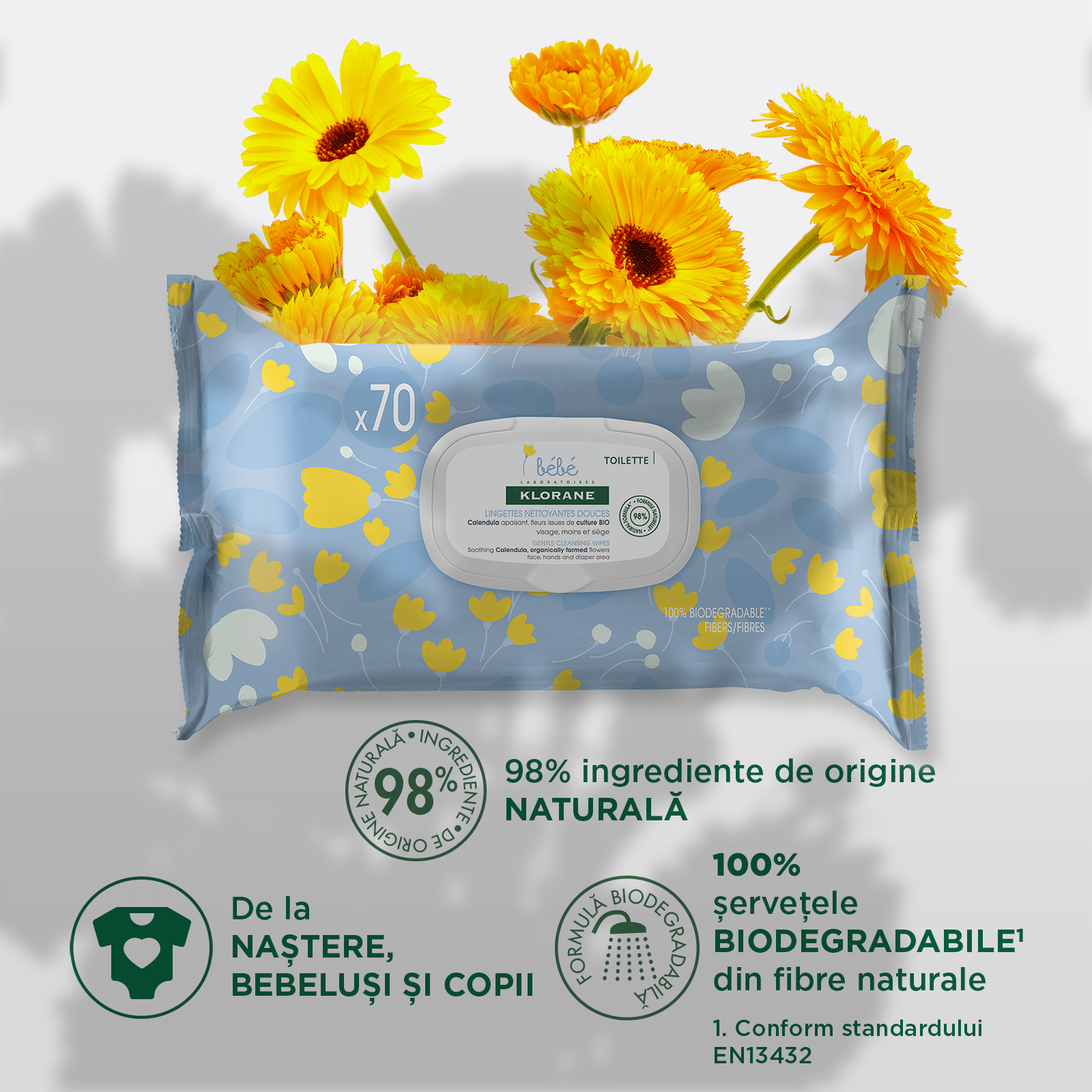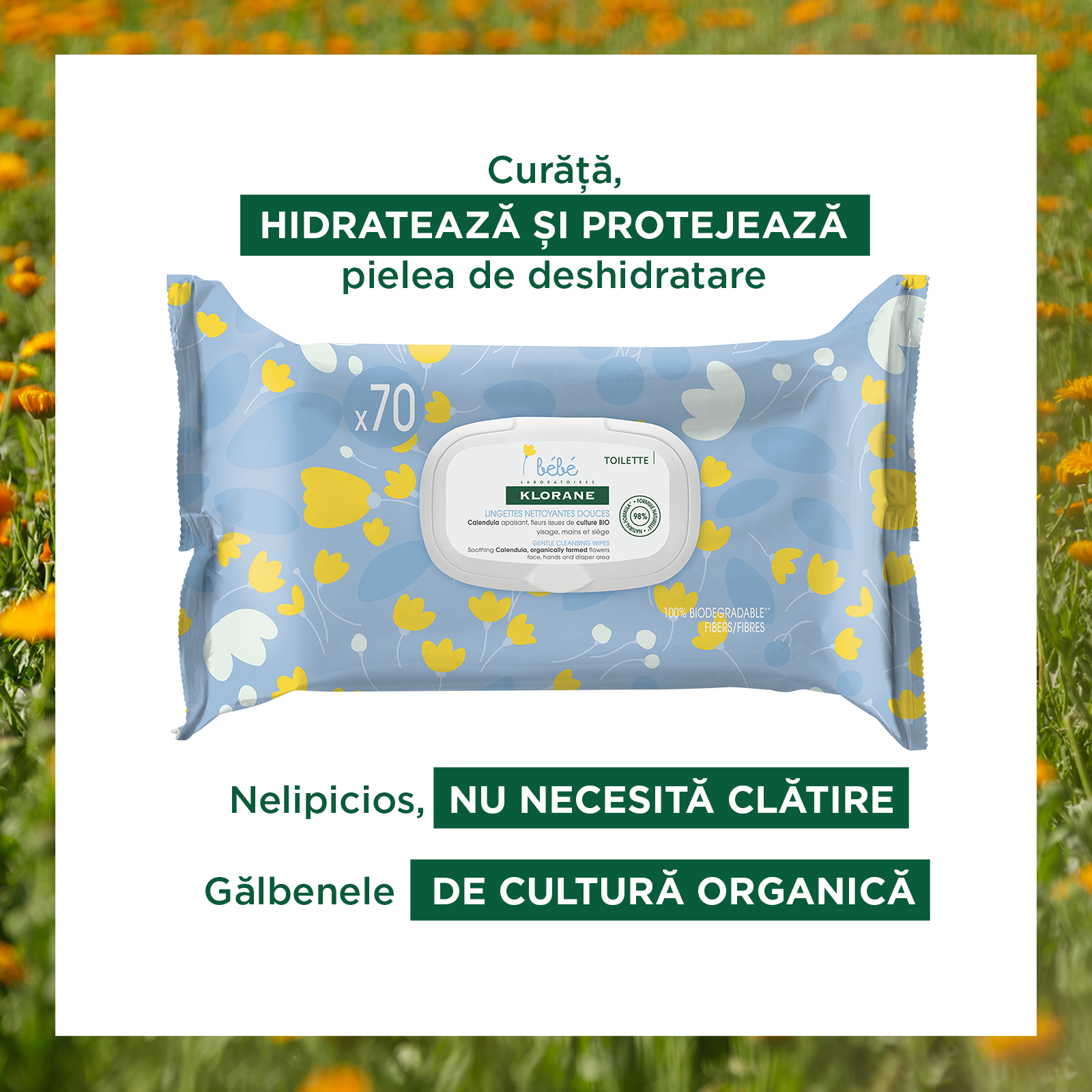 Servetele umede calmante Klorane Bebe cu Galbenele sunt imbogatite cu ingrediente active blande pe baza de plante pentru a purifica, hidrata si proteja pielea. Confectionate din fibre naturale 100% biodegradabile si depozitate intr-un ambalaj resigilabil, servetelele nu necesita clatire, pentru o spalare usoara in afara casei.