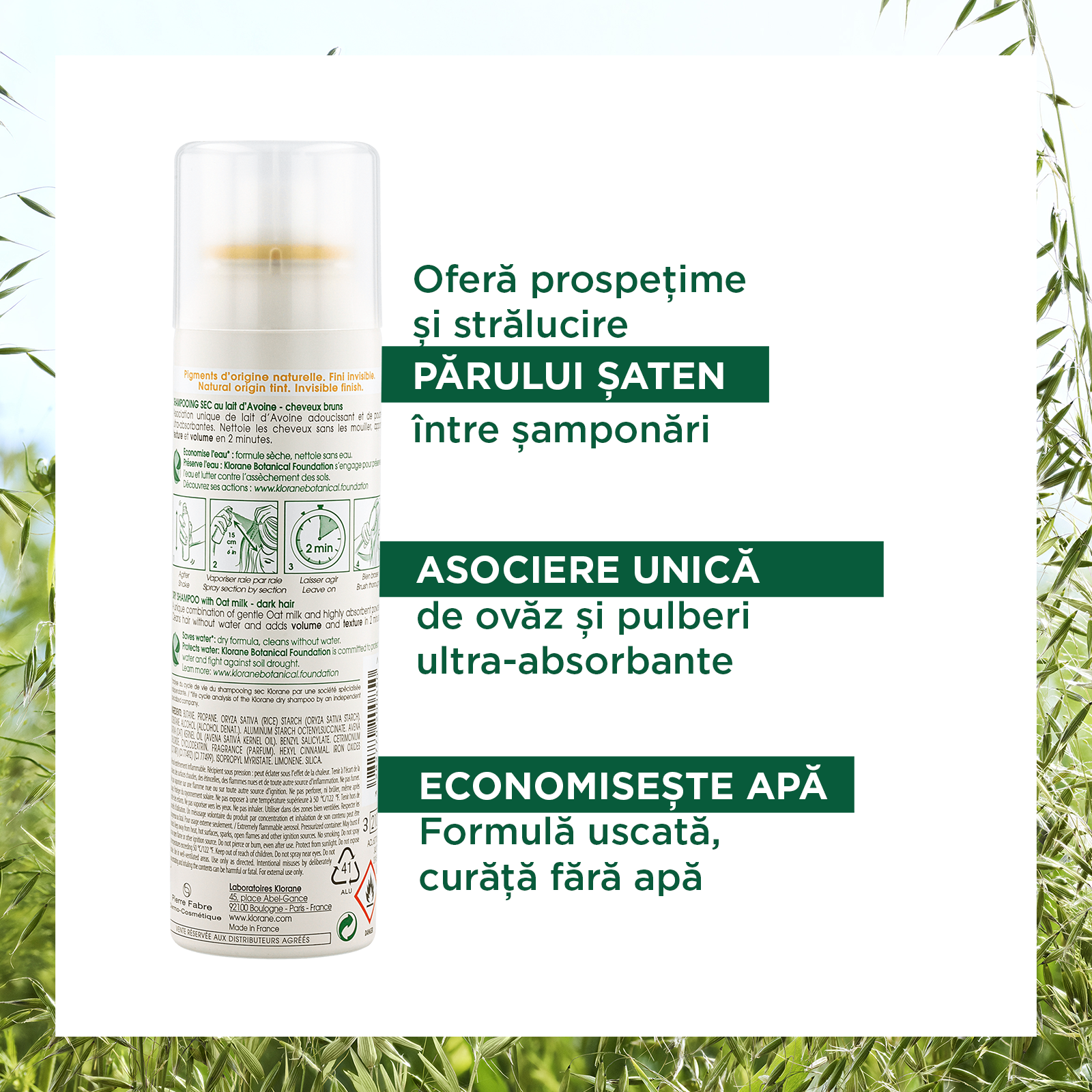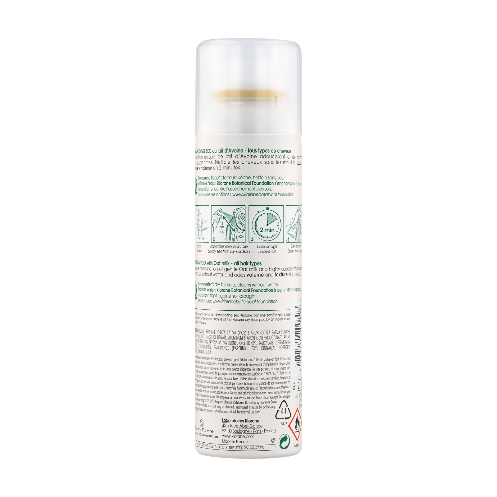 Formula de pulverizare permite o aplicare usoara si nu lasa urme de produs. Din 1971, Klorane s-a angajat sa economiseasca apa cu samponul uscat fara clatire cu lapte de ovaz.