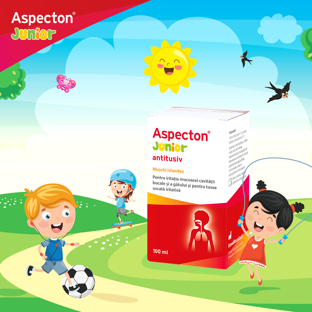 Aspecton Junior Antitusiv este un produs recomandat pentru iritatia membranei mucoase care captuseste cavitatea bucala si gatul, dar si pentru tusea uscata iritativa. Acesta amelioreaza imediat tusea si calmeaza mucoasa cailor respiratorii, formeaza o pelicula protectoare, si poate fi combinat cu expectorante sau alte medicamente pentru raceala.