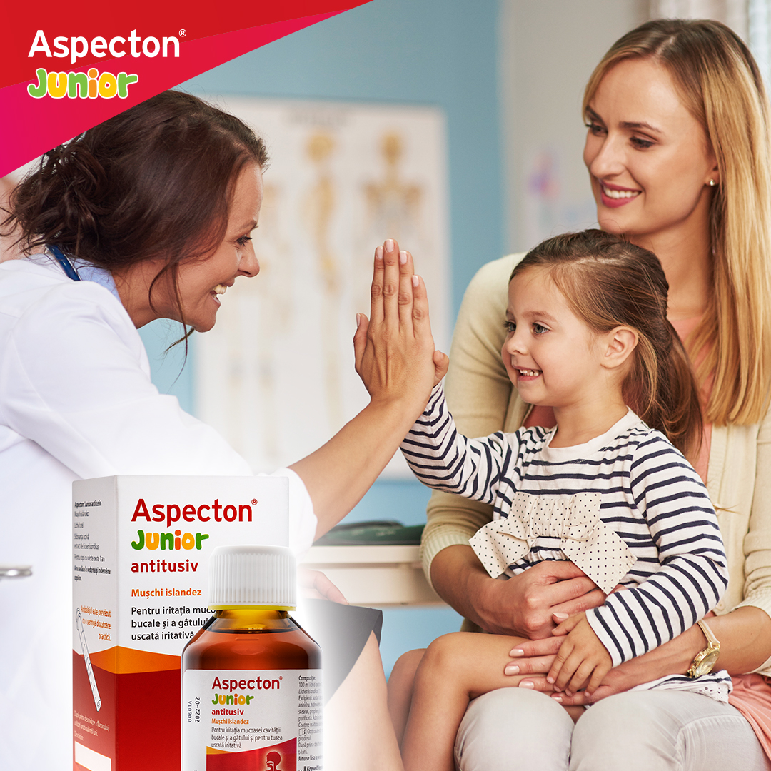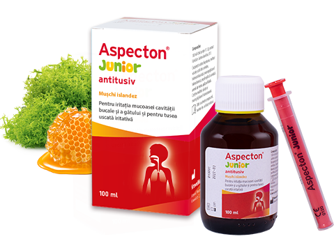 Aspecton Junior Antitusiv este un sirop cu ingredient natural – extract lichid de muschi islandez, recomandat pentru ameliorarea tusei uscate si a iritatiei din gat la copiii peste 1 an. Are un gust delicios de miere si este usor de administrat datorita seringii care permite o dozare corecta, precisa si sterila.