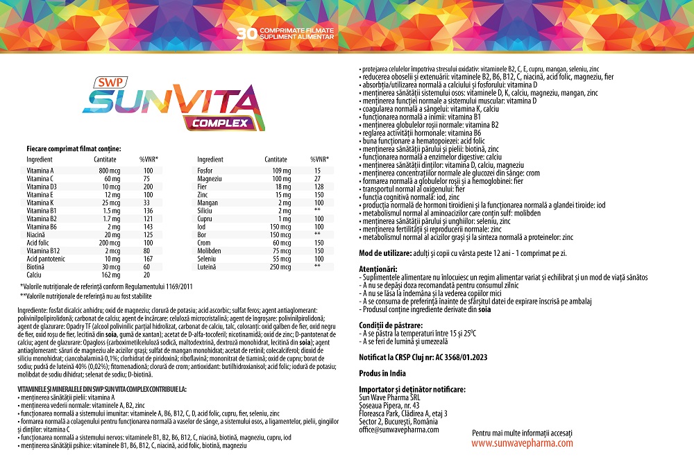 VIitaminele si Mineralele din SWP SUNVITA COMPLEX contribuie la: mentinerea sanatatii pielii: vitamina A, mentinerea vederii normale: vitaminele A, B2, zinc, functionarea normala a sistemului imunitar: vitaminele A, B6, B12, C, D, acid folic, cupru, fier, seleniu, zinc, formarea normala a colagenului pentru functionarea normala a vaselor de sange, a sistemului osos, a ligamentelor, pielii, gingiilor si dintilor: vitamina C.